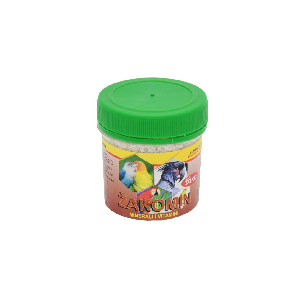 Žakomin je mineralno-vitaminski dodatak koji je veoma važan za sve vrste papagaja, kanarinaca i egzota. Dodaje se svakodnevnoj ishrani i ne može da šteti vašem ljubimcu.