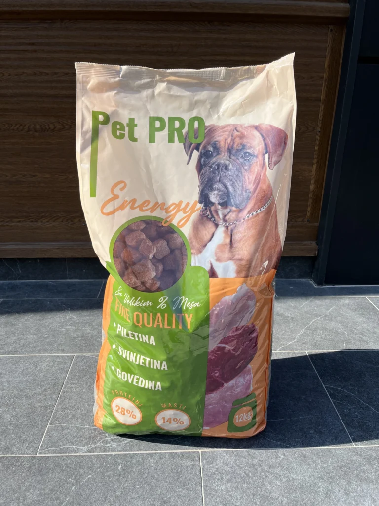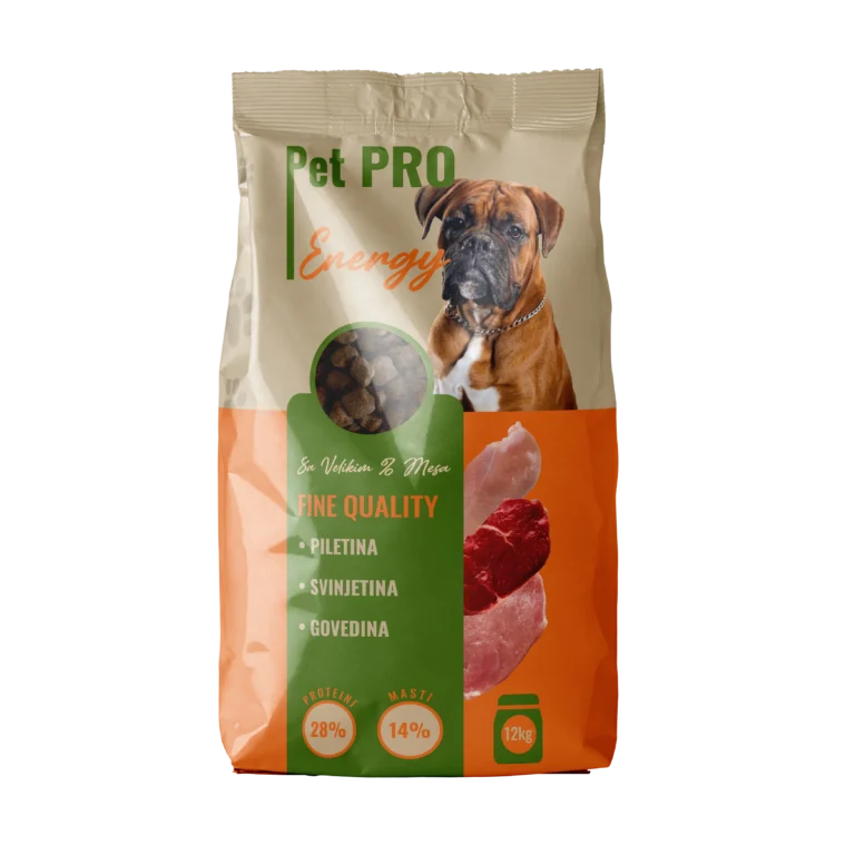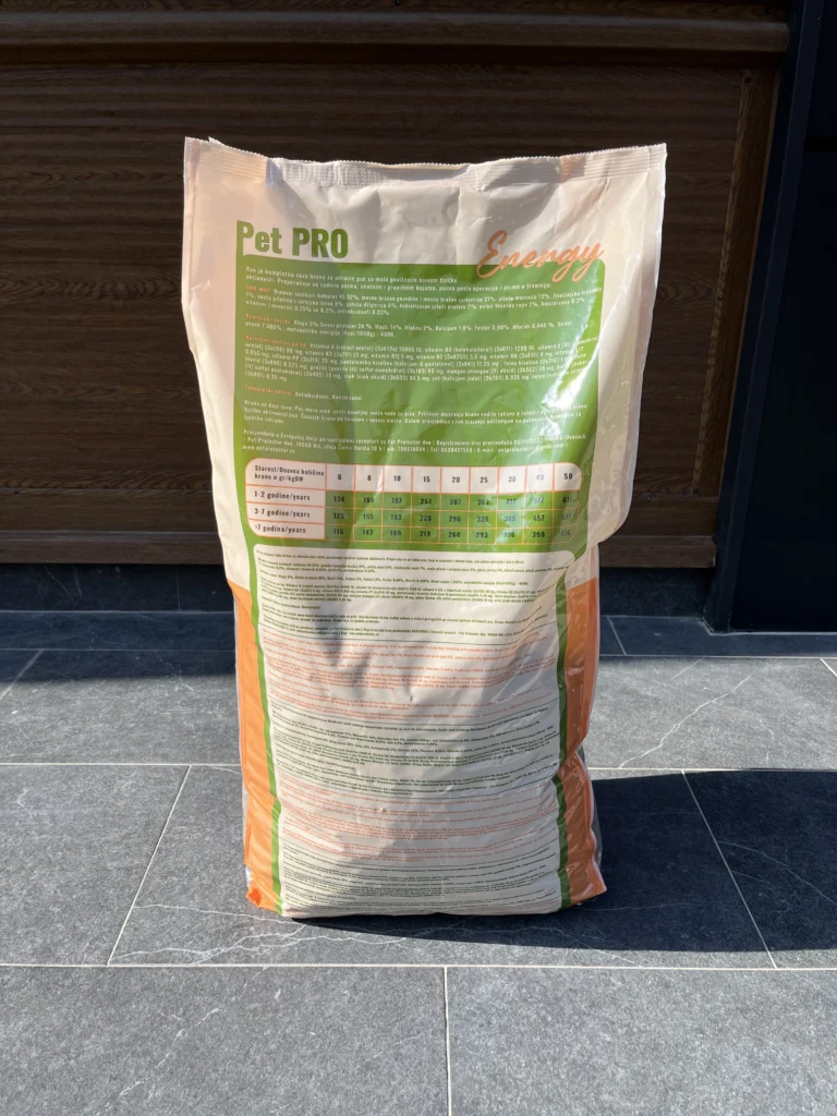 Pet Pro Energy 12 kg je kompletna suva hrana formulisana posebno za odrasle pse sa povećanim energetskim potrebama. Zahvaljujući 28% proteina i 14% masti, pruža snažnu podršku mišićima, izdržljivosti i regeneraciji – idealan je izbor za radne pse, sportske pse, skotne kuje i pse u oporavku.